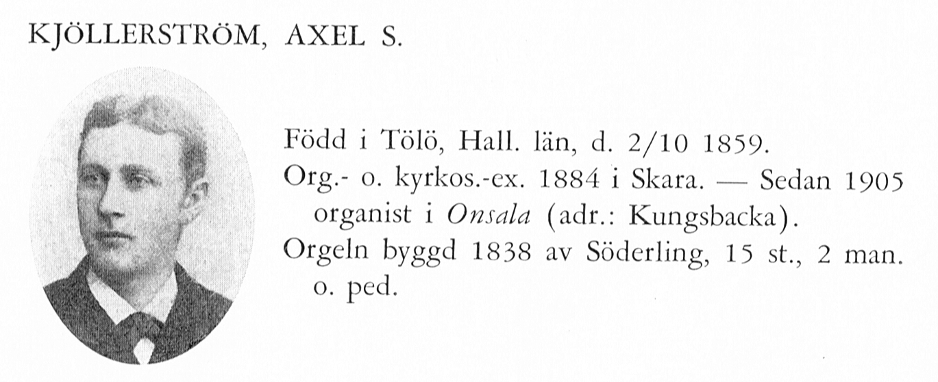 Född 1859-10-02 i Tölö (N). Död 1943-01-27 i Onsala (N). Klockare och organist |