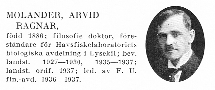 ![]() Arvid Ragnar Molander. Född 1886-03-21 i Tranemo.(P). Död 1965-04-21 i Lysekil.(O). |
